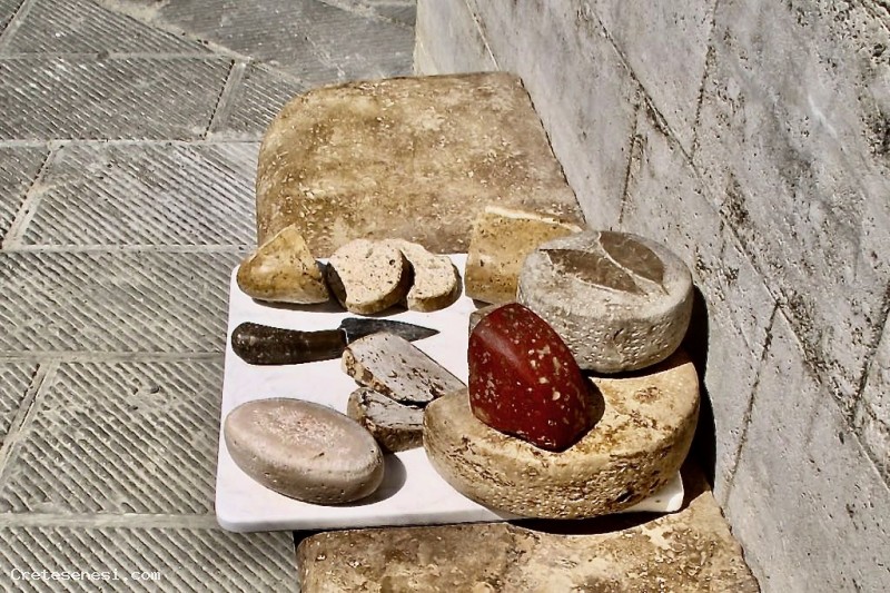 Su una panca in travertino, realizzata come altre che si trovano in paese e ai giardini, è appoggiato un vassoio con sopra: pane casareccio fresco, formaggio pecorino fresco e stagionato e un coltello per il taglio di pane e formaggio.
