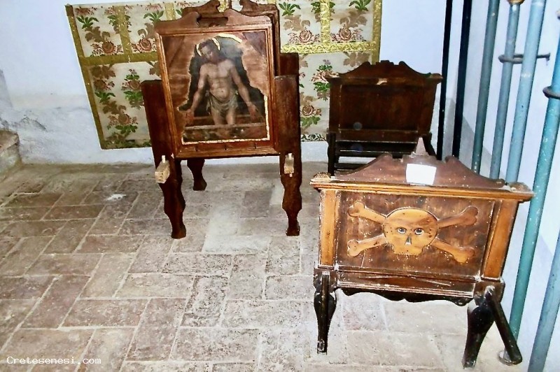 Come ogni Confraternita che si rispetti, anche quella di Montisi ha conservato arredi e oggetti legati alla propria attività di assistenza alle persone e di corredo per le cerimonie religiose.