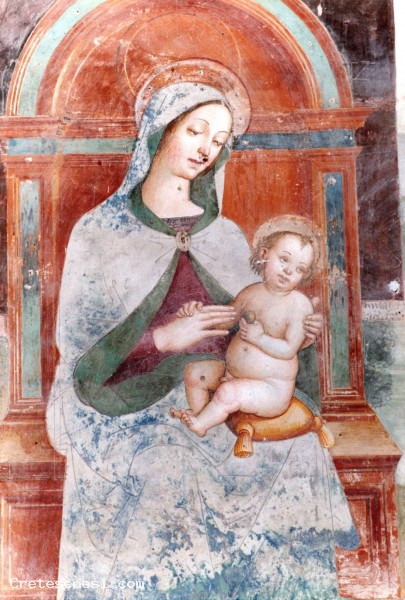 Di questo bellissimo affresco, eseguito a più mani, come appare chiaro, anche da una visione diretta, è abbastanza certa l'attribuzione ad artisti umbri. Secondo recenti studi, infatti la Madonna con Bambino, potrebbe essere di mano del Pinturicchio. Ma ciò che colpisce a prima vista è il volto adolescente e raffinato del giovane Sant'Ippolito, con mantello e spada, l'unico che si rivolge verso l'osservatore.