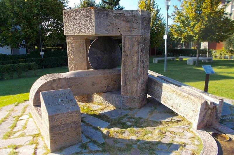 Sculrura moderna collocata su un piccolo spazio verde sulla provinciale nord, poco oltre il giardinetti de I Piani sulla destra