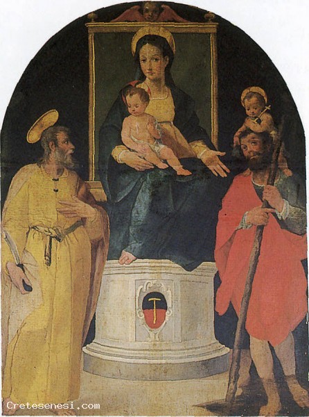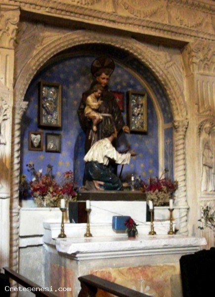 Di origine romanica, priva di facciata e inglobata tra due edifici, era in antico collegata ad un ospizio per pellegrini e infermi chiamato Ospedale del Santo, soppresso nel 1752. La parete in pietra ha un semplice portale con arco a tutto sesto e un altro simile murato, e un piccolo campanile a vela. Sulla parete destra sono emersi affreschi trecenteschi (San Michele Arcangelo e San Francesco). L'altare maggiore ha una bella tela di Vincenzo Rustici (1557-1632) raffigurante la Madonna col Bambino, San Bartolomeo e San Cristoforo. Sulla parete sinistra è l'altare in stucco dedicato a Sant'Antonio da Padova, modellato secondo le cornici architettoniche quattrocentesche, con paraste laterali, cornicione a festoni e lunetta con il Martirio di San Bartolomeo.