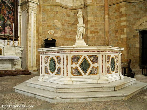 L'attuale fonte battesimale è di Giovanni Vaccà (1760), ma nella nicchia a destra dell'altare è conservato ancora il fonte battesimale scolpito da Andrea Sandsovino (1502). La forma del fonte è ottagonale, nelle fasce laterali dove sono scolpite su cinque faccie il battesimo di Cristo, la Fede, la Giustizia, la Carità, la Speranza, in marmo bianco.