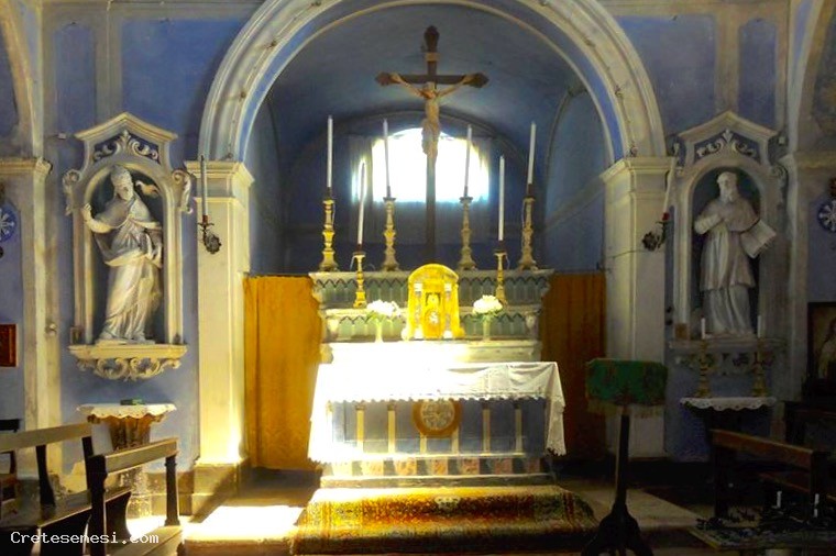 - il secondo altare di destra è dedicato al Crocifisso ed è sormontato da una tela del XVII secolo, originariamente sull'altare maggiore, raffigurante Gesù in Croce tra i Santi Flora, Lucia, Maria Maddalena, Agata e Martino;