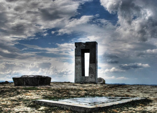 Monumento in pietra realizzati da Jean Paul Philippe nel 1993 e collocato al bivio di tre stradine di campagna fra Mucigliani e Leonina.